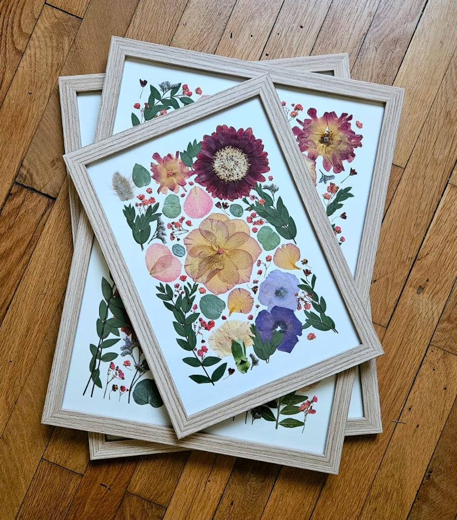 Chaque herbier est présenté dans un cadre en bois soigneusement sélectionné, accompagné d’une vitre en verre classique, afin de mettre en valeur la délicatesse de la composition.